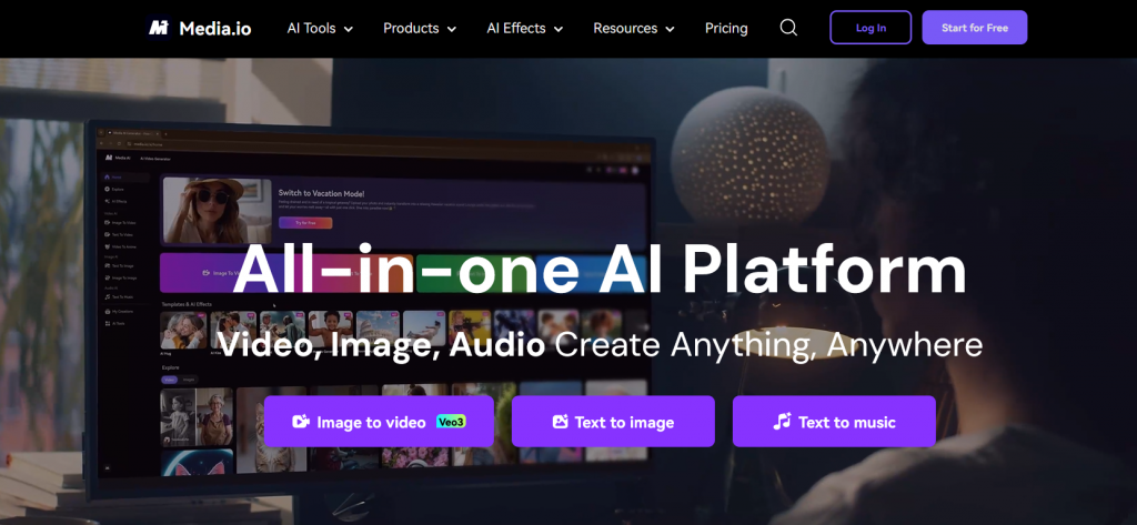 Media.io adalah platform all-in-one berbasis cloud untuk mengedit media (video, audio, gambar) yang dilengkapi banyak fitur berbasis AI. Media.io+2Media.io+2