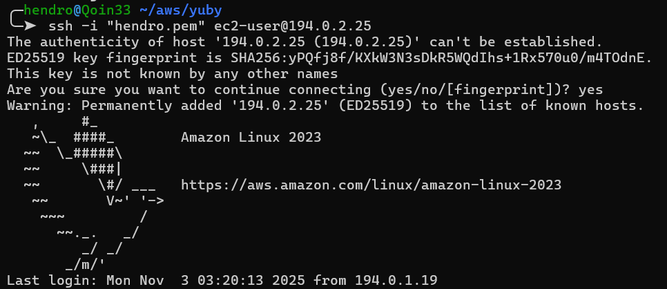 - login ke EC2 server misal ip public 16.79.136.76 dan IP local 194.0.1.19